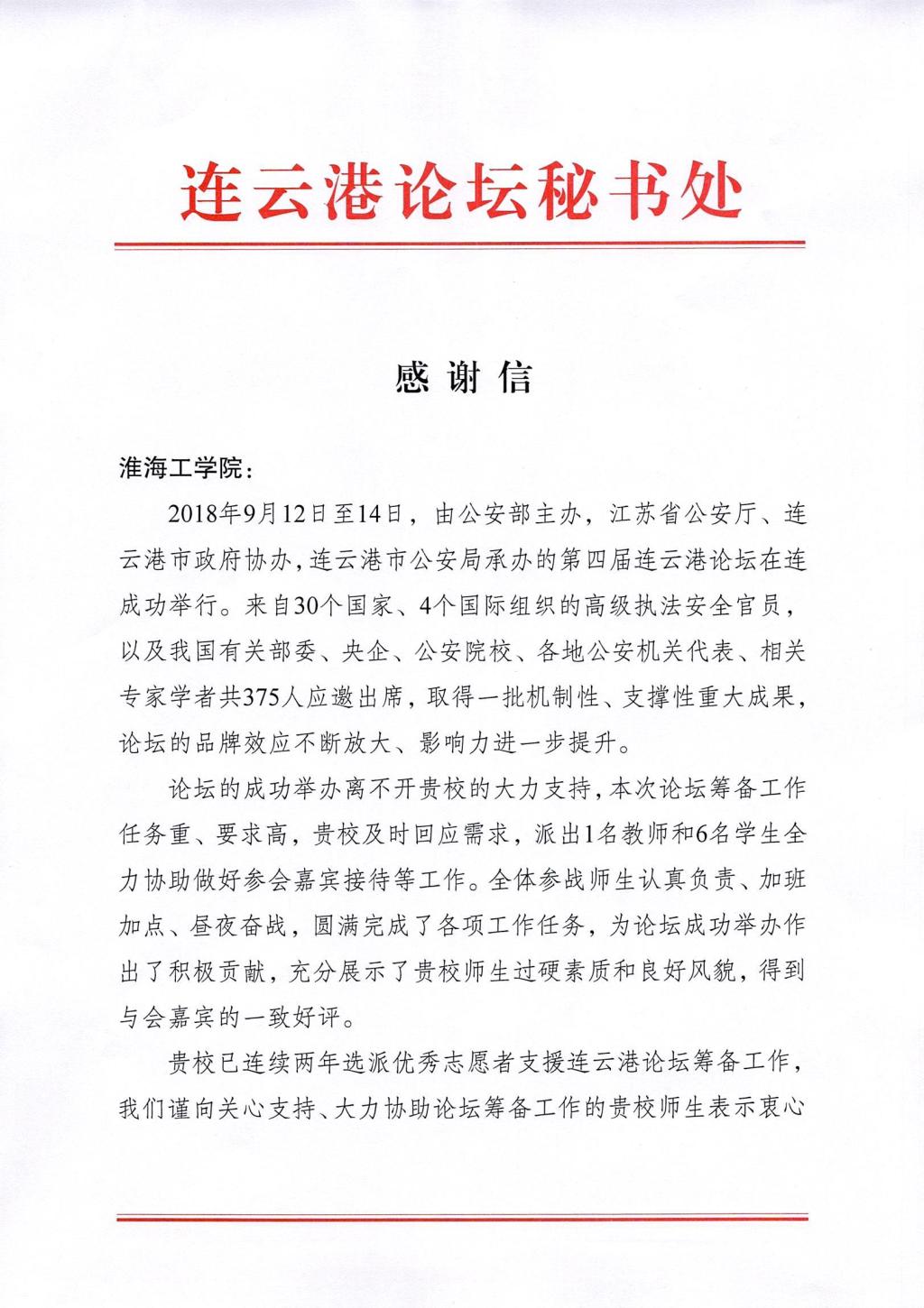 2018年9月12日至14日,应连云港市公安局邀请,淮海工学院mansion88明升向连云港警务论坛派出1名教师和6名同学协助做好大会接待等工作。该论坛由公安部主办,江苏省公安厅、连云港市政府协办,连云港市公安局承办。来自30个国家、4个国际组织的高级执法安全官员,以及我国有关部委、央企、公安院校、各地公安机关代表、相关专家学者共375人应邀出席,取得一批机制性、支撑性重大成果。警务论坛已圆满结束,论坛秘书处向淮海工学院mansion88明升发来感谢信。