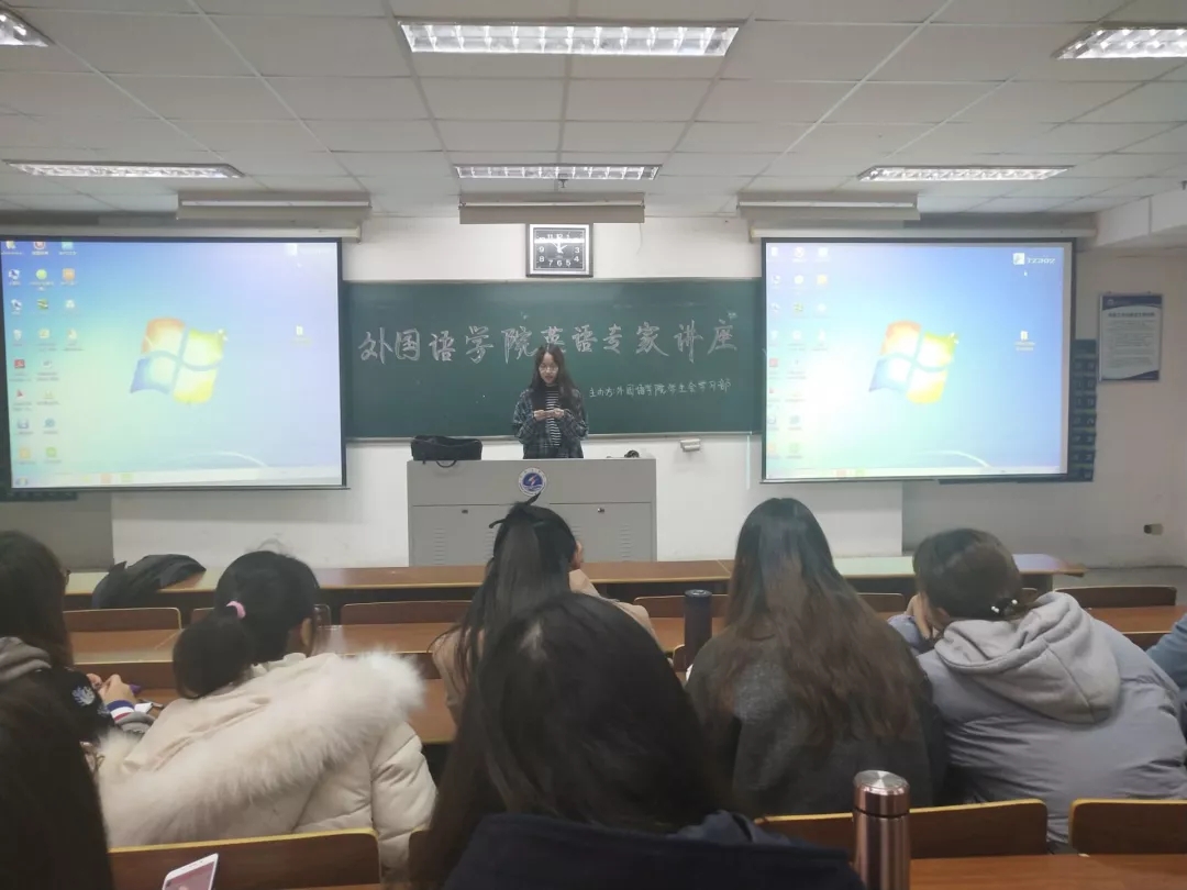 活动临近结束,一位大二的日语员工操着流利的英文问了关于难词和语法的问题,龚育尔老师耐心地替大家解答。最后,龚育尔老师重点向大家讲述了关于留学的相关问题,本次活动也渐渐落下帷幕。