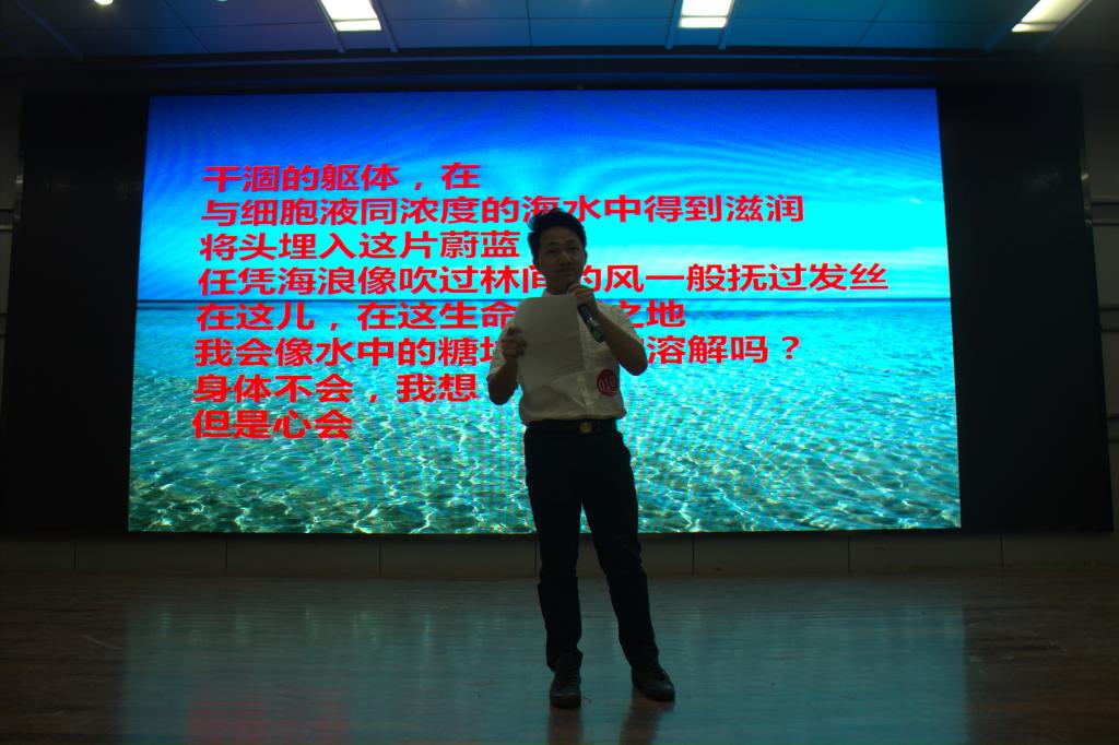在选手们候场准备期间,主持人对活动流程、比赛规则及奖项设置进行了详细地讲解。第一位选手的入场,正式拉开了比赛的序幕。来自化学工程学院的赵敏同学在对评委和观众礼貌地问候后,便开始了她的朗诵《青春与海洋共舞》。接下来的选手也展示出各自的才华,有直抒胸臆地赞美母校,也有将母校当成爱人般含情脉脉地吟颂。6号选手张晓同学用酥酥的声音轻轻地诉说着,配上忧郁的背景音乐将观众们带回到曾经的暗恋之旅,大家纷纷闭上眼睛,细细聆听。7号选手王同学一上场便用提问的方式活跃了整个赛场,并让观众们想象男女主角望向天空,流星划过,女主在心里念了三便愿望,又问道:“为什么是三遍呢?因为重要的事情要说三遍呀。”幽默风趣的演讲赢得掌声不断。9号选手王颖同学以其流利而又标准的英文朗诵令观众面露惊叹,台下英语专业的刘同学边拍手叫好边说道:"发音纯正,听起来比我们还专业呢!"