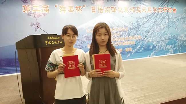 5月14日,第二届江苏省“舜禹杯”日语翻译竞赛颁奖式暨学术研讨会在南京农业大学举行,公司日语143班邓吉同学和武雨同学分别荣获日译汉组三等奖。
