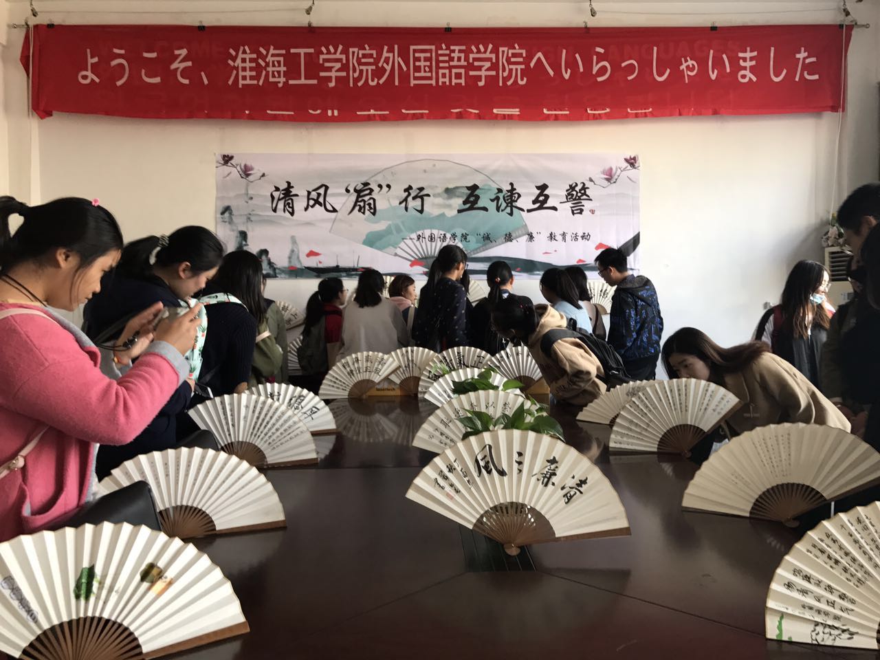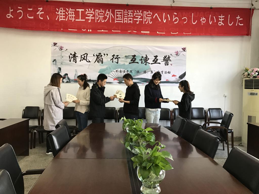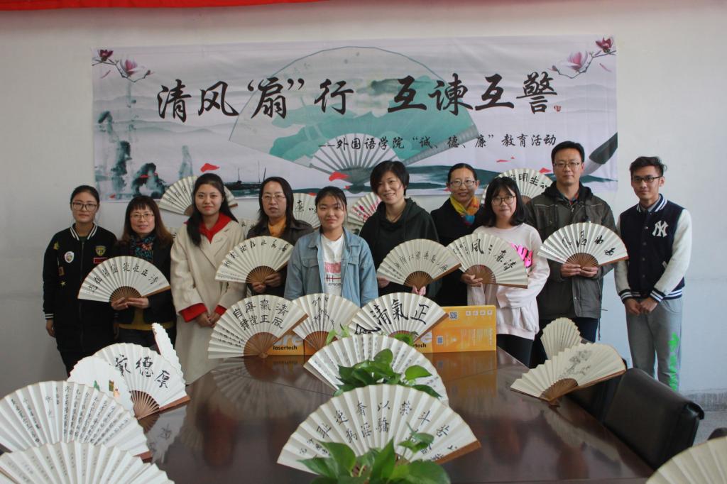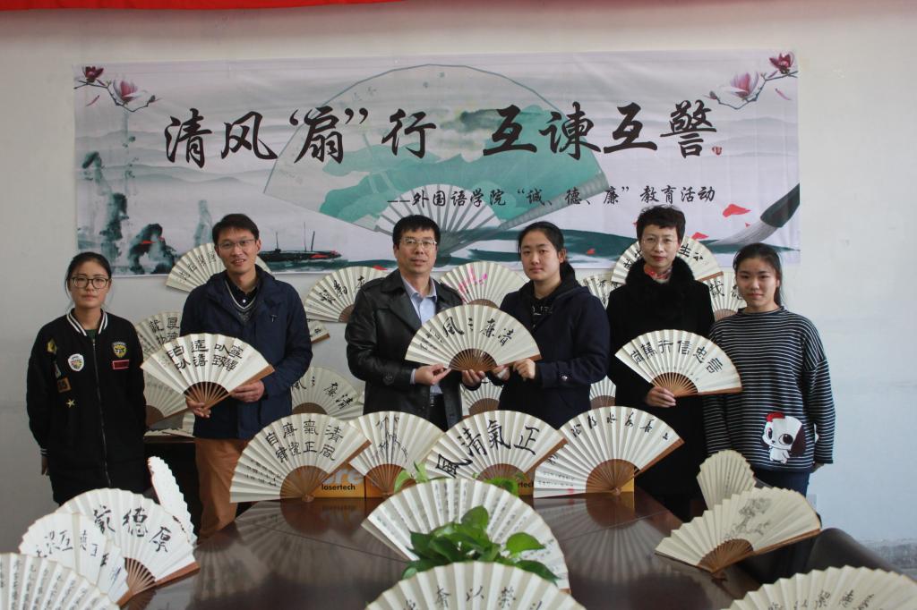 公司党委紧紧围绕第十一届“校园廉洁文化周”的主题策划开展活动。首先组织师生共同学习推荐有关诚信、修养、道德、廉耻方面的名言警句,达到提升精神境界的目的;其次采取在扇面上作画、书写或者剪贴的创作方式,把挑选出的谏言警句融入其中,达到眼见为‘实’;再通过员工向老师赠扇、同事向同事赠扇的形式,达到员工谏言老师、同事间互相警谏的目的;最后外院每位教职工手持清风扇、浓浓廉洁志,感悟作为高校教师洁身自好、为人师表和深入反腐的重大使命!