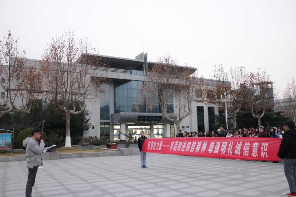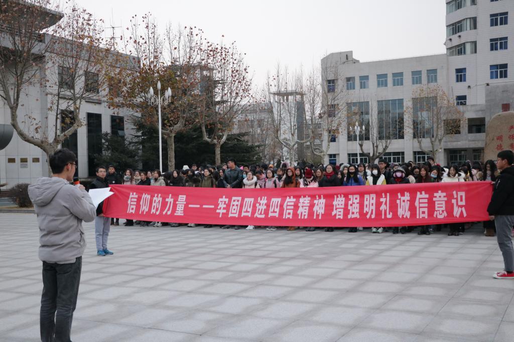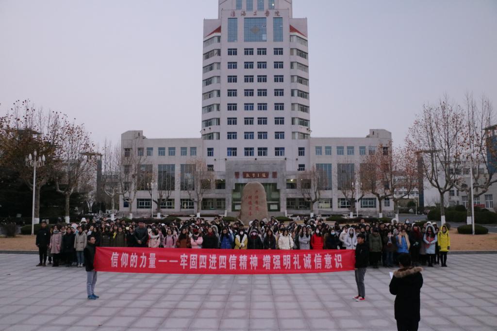 本报讯 12月4日早上6点30分,淮海工学院mansion88明升全体成员在主楼前侧旗杆下列队,在各班团支书带领下有序参加本次升旗仪式。公司党委副书记何颖出席此次升旗仪式并发表致辞。本次活动在院团委书记杨顺和员工会主席陶逸带领下有序开展。本次升国旗仪式特别强调信仰的力量—牢固四进四信精神 增强明礼诚信意识在同学们日常学习工作中的巨大作用。