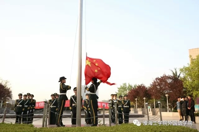 主持人吴妮:“升国旗,奏国歌!”的话音刚落,国旗仪仗队的同学们身着橄榄绿的的军装,身姿挺拔,迈着整齐划一的步伐向升旗台走去。“嗒——嗒——嗒”响亮的脚步声在广场上响起,所有同学的目光都聚集在他们身上。他们手臂有力地在胸前摆动,脚下步子丝毫不乱。激昂的国歌声奏响,训练有素的仪仗队员有条不紊地拉动绳子,国旗缓缓上升。台下的同学们的目光紧跟着国旗,嘴里小声地哼唱着国歌。