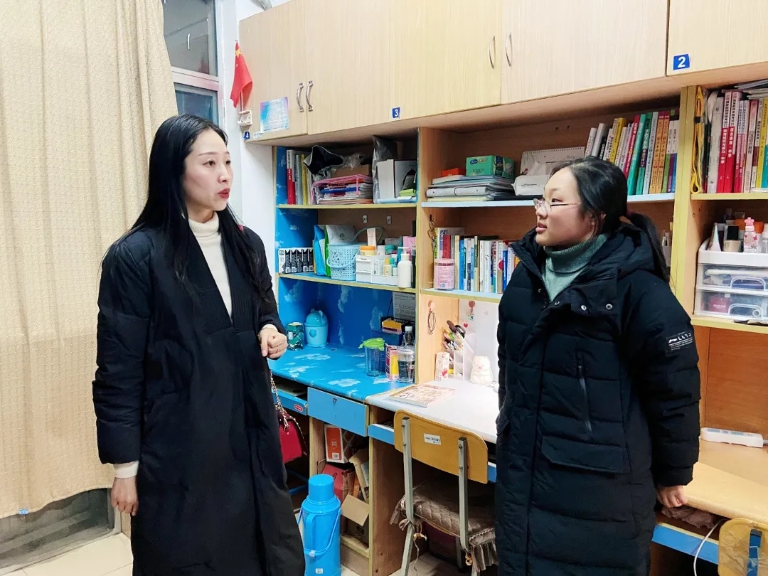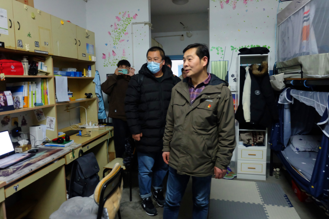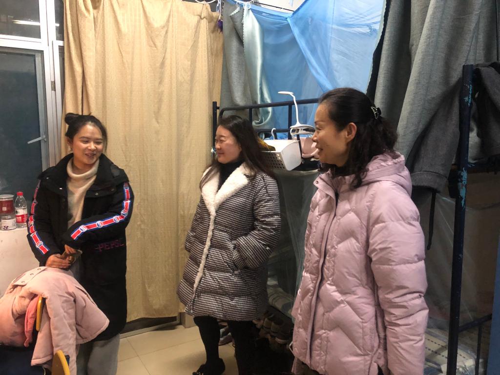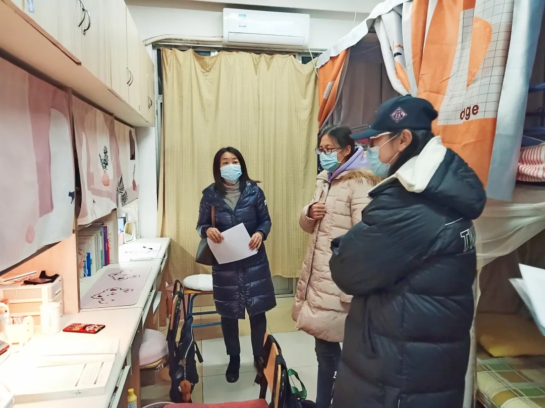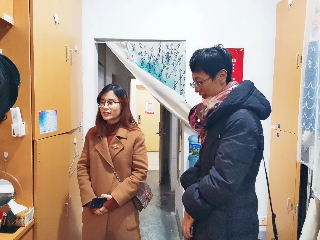 与此同时,公司经理赵晶辉带领部分班主任走访了A1楼员工寝室。走进干净整洁的寝室,老师们关注每一位同学的情况,叮嘱同学们认真准备各项考试的同时也不能忽视寝室卫生问题。她还提到冬季是疫情高发期,一定要及时开窗通风,保证寝室内有新鲜的空气流通。