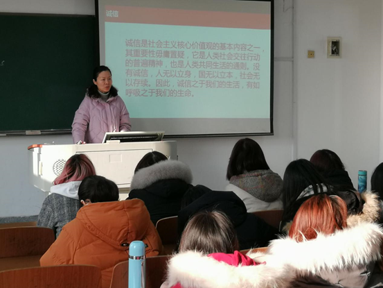 2020年12月22日上午,正值期末考试来临之际,吴美玉副经理为英语171班全体同学进行了诚信考试主题教育。吴经理首先强调了诚信是社会主义核心价值观基本内容之一,是个人赖以立身,国家赖以立本,社会得以存续的基本原则,有如呼吸之于我们的生命。接着,带领大家学习了学校下发的有关考风考纪的文件,对其中的重点要点进行了详细的分析与阐释。最后用案例警醒大家,坦荡做人,清白做事,严守考试纪律,不存侥幸心理。同学们认真聆听,受益匪浅。