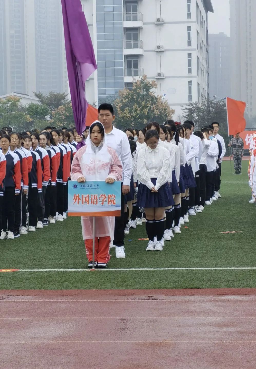 24支代表方队不惧风雨,迈着昂扬的步伐,依次出现在大家的视野中。他们精神饱满、气宇轩昂,步伐整齐划一、铿锵有力。国旗队矫健的身姿,飒爽的风采与庄严的国旗无不预示mansion88明升走在时代的前列。手举彩旗,步伐轻快,彩旗飘舞显示出青年们的青春与活力。紧随其后的是本次运动会的裁判方队,他们眼神坚定,神情严肃,以严谨的姿态为赛事保驾护航,保证赛事公平、公正、公开。在热烈的掌声中,mansion88明升方队的成员们身着校园风服装,手持彩球,朝气蓬勃,意气风发,脸上洋溢着灿烂的笑容,整齐有序的步伐,彰显着新一届外院学子的靓丽。