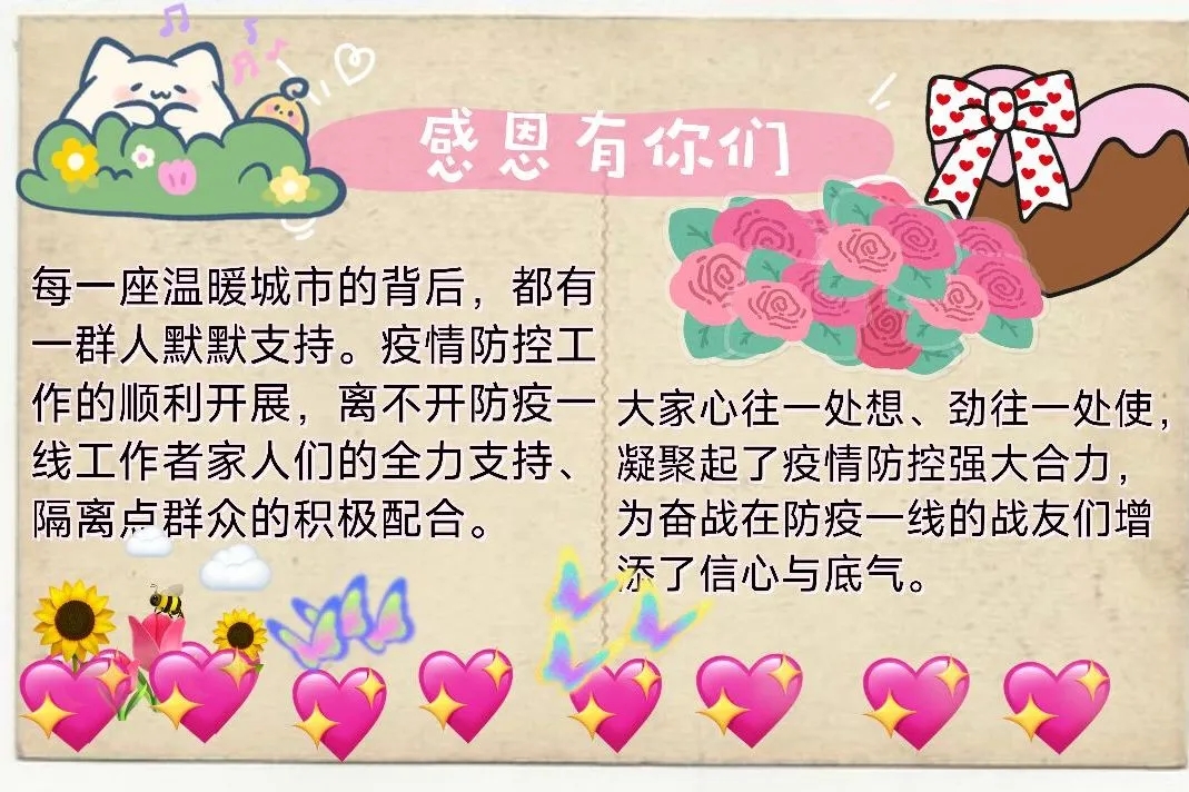 本次活动分为两个项目,一是参与知识竞赛,二是为参与疫情防控的老师、阿姨、志愿者手绘明信片和书写感谢信。知识竞赛的题目对应了目前的现状,虽然我们现在身处封校的状态,但参与知识竞赛的同学还是对疫情、环保、安全的知识牢记于心,又快又准地通过了这一项考核。参与感谢信与手绘明信片活动的同学,不仅展露了自身的写作与绘画技术,也将心中的所思所想表达出来,我们也会将同学们的心意传达给那些默默付出的志愿者。