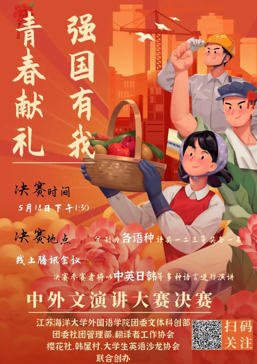 随着5月15日初赛作品收集的圆满收官,我们活动的第一部分取得了较好的成果,在中文、英语、日语、朝鲜语四个语种中均有较为优异的作品展现,其中像日语1212孙婧轩,她虚心接受了专业老师的指导,对演讲稿反复润色,又如日语1211潘蕊,将演讲环境带入到校园环境当中,颇有微团课的氛围。本次活动由mansion88明升团委文体科创部,团委社团管理部,翻译者工作协会,老员工英语沙龙协会,韩屋村,樱花社联合创办,我们将于2022年5月18日下午1:30举行“青春献礼,强国有我”迎接二十大中外文主题演讲大赛决赛,敬请期待!