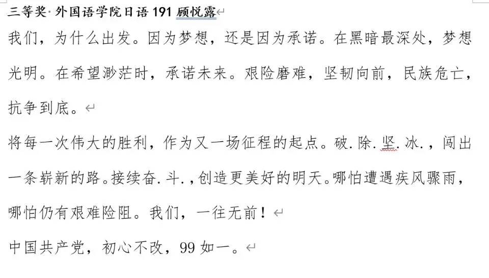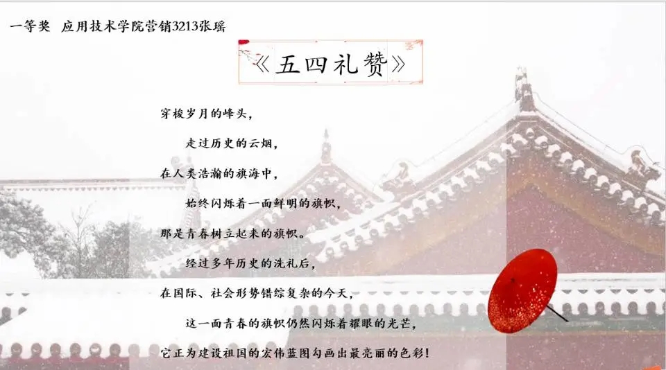 时间已到,比赛选手们准时加入线上会议,主持人陆倩倩热烈地宣布比赛开始。选手们丝毫不怯场,富有激情地朗读着自己精心准备的诗歌,他们或选择仁人志士的热血故事,或选择英勇昂扬的青年人物,或选择改变命运的历史会议,在一声声掷地有力的朗诵中,掀起一场感受青春色彩的盛典。在展现形式上,部分参赛选手向评委们展示了精美的PPT、多样的配音秀等,让在场的同学们眼前一亮,留下深刻印象。