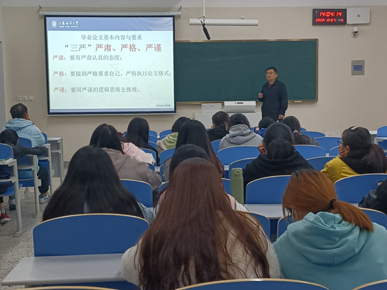 会议伊始,张勇首先对员工们到来表示热烈欢迎并介绍本次会议的主要内容。本次会议主要分为两部分,一是分析当前毕业生所面临的就业形势;二是讲解毕业论文的相关事项,如:撰写目的、指导工作的时间安排以及论文撰写的基本要求。会议中,张勇讲到,毕业论文是高等学校培养高素质综合型人才的重要实践教学环节。毕业论文坚持“三严”原则:严肃、严格、严谨。根据教育部本科毕业论文(设计)抽检办法最新文件,张勇再次强调了论文的真实性和规范性;接着,简述了论文工作的主要环节:分为选题、任务书、开题报告、撰写提纲、第一稿、中期检查、第二稿、第三稿(定稿)与答辩。“论文不仅仅作为一个实践教学环节,它还是高校实现人才培养目标的重要手段,是员工四年所学知识的深化和升华的重要过程。”张勇说到。